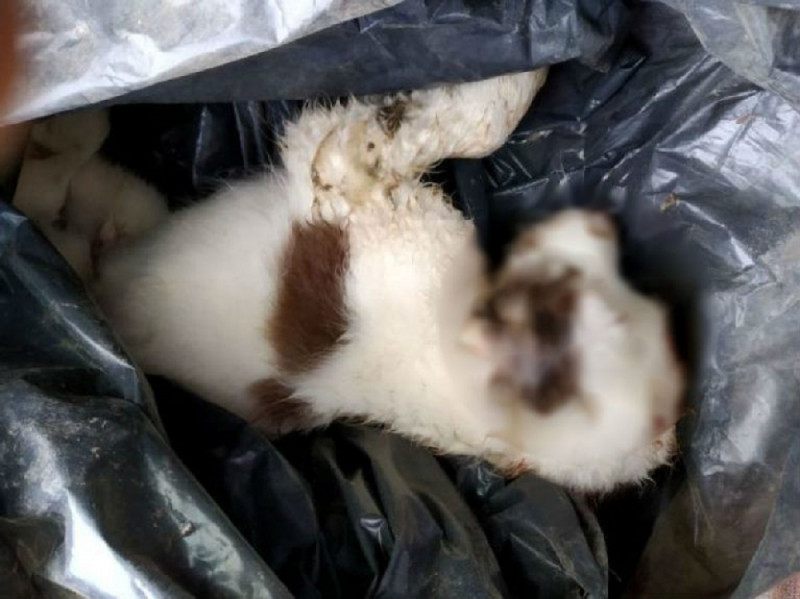 Ανοίγοντας τη σακούλα, είδε δύο αιματοβαμμένα κουταβάκια, το ένα εκ των δύο ήταν νεκρό και το άλλο ετοιμοθάνατο.