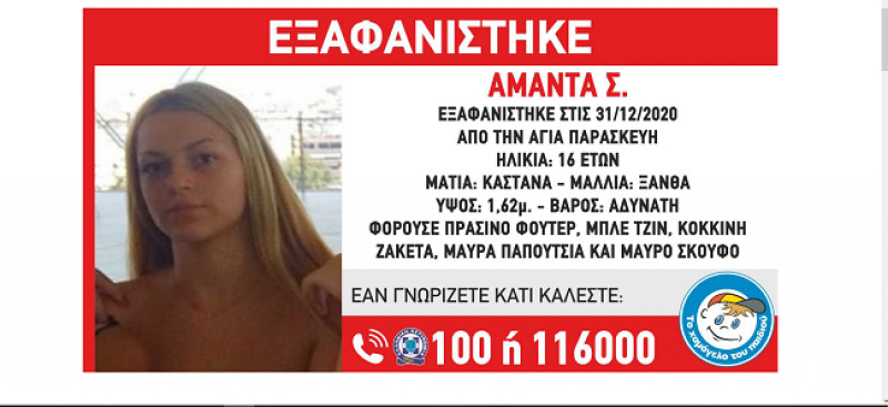 «Στις 31/12/2020, και ώρα 21.00, εξαφανίστηκε από την περιοχή της Αγίας Παρασκευής, η Αμάντα Σ. 16 ετών. «Το Χαμόγελο του Παιδιού» ενημερώθηκε σήμερα, 12/1/2021, για την εξαφάνιση της ανήλικης και άμεσα προέβη, στη δημοσιοποίηση των στοιχείων της κατόπιν Εισαγγελικής εντολής.