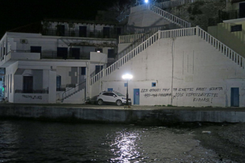 Οι άγνωστοι έγραψαν συνθήματα όπως: «πρόστιμο 15.000 ευρώ» αλλά και «Δεν φτανει που τα έχετε κάνει σκ@τά με την πανδημία, μας κοροιδεύετε κιόλας».