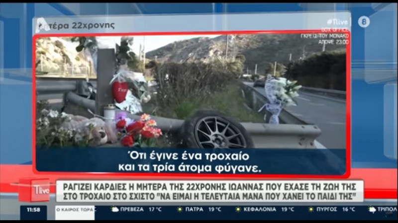 Μας είπαν ότι έγινε ένα τροχαίο και τα τρία άτομα φύγανε. Μέσα σε αυτά τα τρία άτομα ήταν και το δικό μας το παιδί. Δεν το πίστευα. Μας πήγαν κάτω και μας το έδειξαν. Ελπίζω να είμαι η τελευταία, να μην τυχαίνει σε καμία μάνα να φεύγει το παιδί της. Αχ Παναγία μου» είπε χωρίς να μπορέσει να συγκρατήσει τα δάκρυά της.