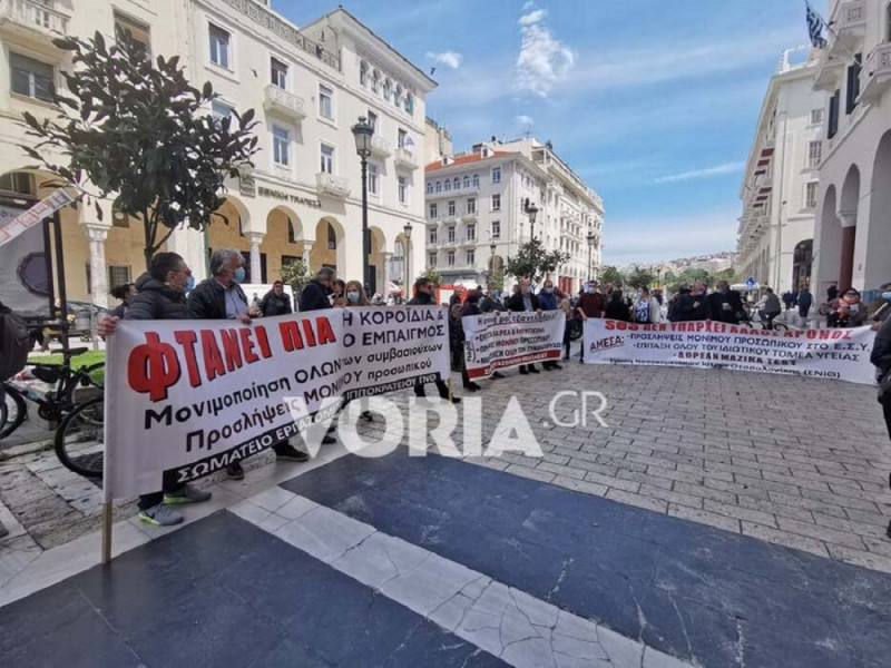 Εργαζόμενοι στα νοσοκομεία της πόλης συγκεντρώθηκαν έξω από τα γραφεία της 3ης και της 3ης ΥΠΕ στην Αριστοτέλους και στη συνέχεια πραγματοποίησαν πορεία διαμαρτυρίας μέχρι το άγαλμα του Βενιζέλου, όπου ενώθηκαν με τη συγκέντρωση που κάλεσαν οι φοιτητικοί σύλλογοι της πόλης.
