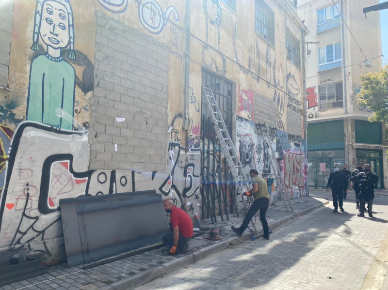 Η νέα επιχείρηση της αστυνομίας για τη σφράγιση του πρώην θεάτρου «Εμπρός στην περιοχή του Ψυρρή, ξεκίνησε από νωρίς το πρωί της Δευτέρας, 24 Μαΐου, με τα συνεργεία να τοποθετούν τσιμεντόλιθους στα παράθυρα και σιδερένιες πλάκες στις εισόδους του κτιρίου, με την επίβλεψη της Αστυνομίας.
