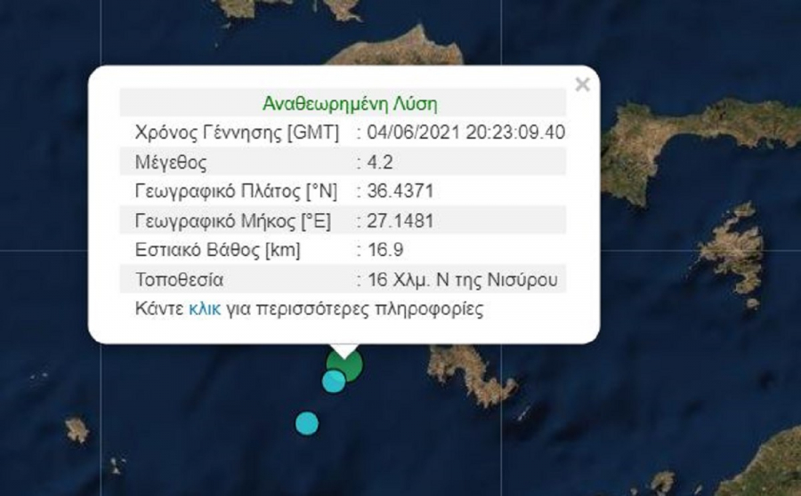 Το επίκεντρο του σεισμού εντοπίστηκε 16 χλμ νότια της Νισύρου, ενώ το εστιακό βάθος τους σεισμού υπολογίζεται στα 16,9 χλμ.