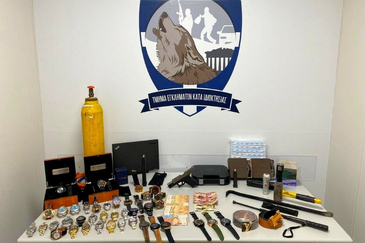 Στην κατοχή τους, καθώς και από τις έρευνες σε οικίες και χώρους, βρέθηκαν και κατασχέθηκαν φιάλη υγραερίου, ηλεκτρικά καλώδια, φυτίλια, πιστόλι, φυσίγγια, λοστοί, βαριοπούλα, μικροποσότητα κάνναβης, πλήθος ρολογιών, κινητά τηλέφωνα και κάρτες SIM.