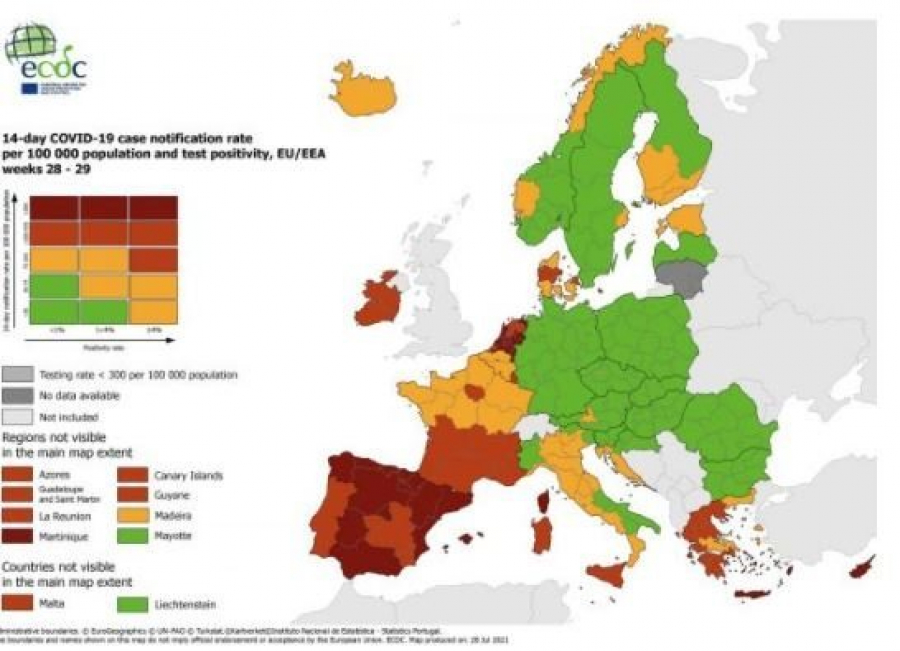Πορτοκαλί χρώμα έχουν οι περισσότερες περιοχές της Ελλάδας στον χάρτη του ECDC, ενώ στο κόκκινο εξακολουθεί να είναι η Κρήτη και κάποια νησιά του Αιγαίου.