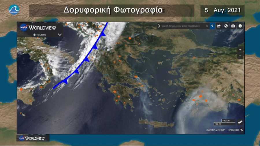 «Στη δορυφορική διακρίνονται οι #πυρκαγιές σε Ελλάδα και Τουρκία και ο #καπνός από αυτές. Επίσης φαίνεται το #μέτωπο που πλησιάζει τη χώρα και θα στρέψει τους ανέμους σε ΒΔ και θα τους ενισχύσει. Οι βροχές θα επηρεάσουν τα βoρειότερα και όχι τις περιοχές των πυρκαγιών