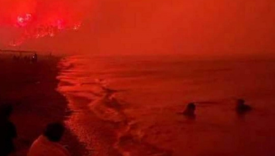 Στη φωτογραφία που ανέβηκε στο facebook από τη σελίδα «Προώθηση της Εύβοιας» φαίνεται η παραλία της Αγίας Άννας έχει μετατραπεί σε πύρινη κόλαση με ανθρώπους να βρίσκουν καταφύγιο στο νερό και να περιμένουν να τους διασώσουν τα πλωτά μέσα.