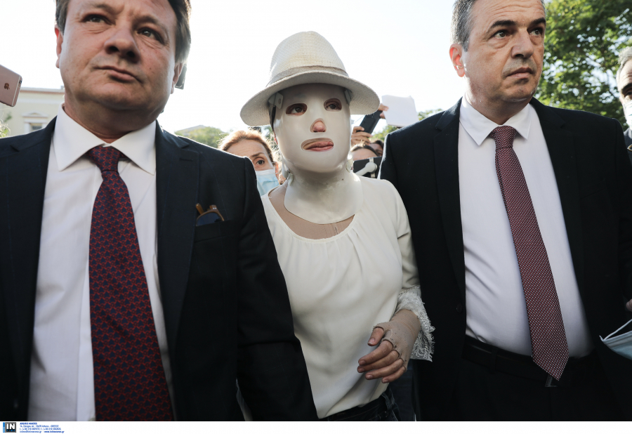 Η Ιωάννα Παλιοσπύρου, έχοντας στο πλευρό της συγγενικά πρόσωπα και τους δικηγόρους της, εμφανίστηκε φορώντας μια προστατευτική μάσκα, την οποία φορούν ασθενείς με εγκαύματα, όταν το δέρμα τους αρχίζει να επουλώνεται.