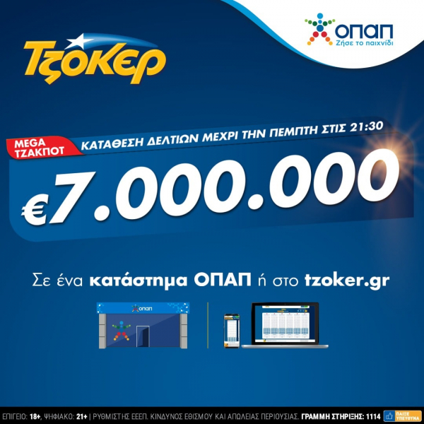 Η κατάθεση δελτίων ΤΖΟΚΕΡ εν όψει της αποψινής κλήρωσης, που θα πραγματοποιηθεί στις 22:00, θα ολοκληρωθεί στις 21:30. Οι παίκτες που θέλουν να διεκδικήσουν το έπαθλο των 7 εκατ. ευρώ μπορούν να επισκεφθούν το πλησιέστερο κατάστημα ΟΠΑΠ ή να καταθέσουν το δελτίο τους, από όπου και αν βρίσκονται, μέσω υπολογιστή, κινητού τηλεφώνου ή tablet.