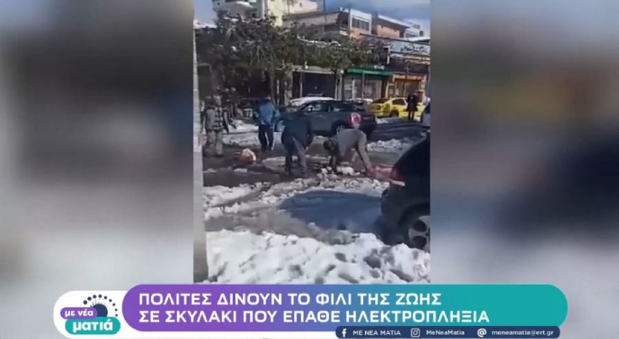 Η σκυλίτσα έπαθε ηλεκτροπληξία στην Λεωφόρο Ιασωνίδου στο Ελληνικό καθώς πάτησε ηλεκτροφόρα καλώδια που είχαν πέσει στο δρόμο λόγω του χιονιά.