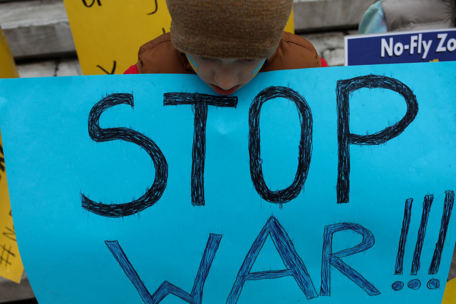 Στο πλαίσιο συγκέντρωσης κατά του πολέμου στην Ουκρανία, άνθρωποι όλων των ηλικιών, κρατώντας σημαίες με τα χρώματα της Ουκρανίας αλλά και πλακάτ, συγκεντρώθηκαν μπροστά από τον Λευκό Πύργο και έστειλαν μήνυμα ειρήνης, ενώ μάλιστα έψαλαν τους εθνικούς ύμνους των δύο χωρών.