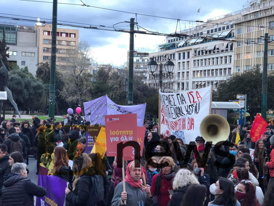 Με κεντρικό σύνθημα « η Ημέρα της Γυναίκας δεν είναι γιορτή, είναι μέρα αγώνα - ενάντια στις γυναικοκτονίες και τους πλούσιους βιαστές», πλήθος κόσμου συγκεντρώθηκε στην πλατεία Κλαυθμώνος και στο Σύνταγμα προκειμένου να διαδηλώσει για την 8η Μάρτη, Παγκόσμια Ημέρα των Γυναικών.
