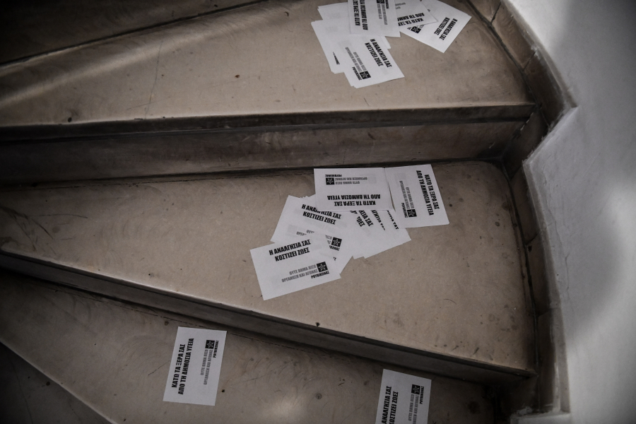 Περισσότερα από 20 μέλη της αναρχικής συλλογικότητας προσέγγισαν το κτίριο από την Λεωφόρο Πειραιώς, πέταξαν φέιγ βολάν και άνοιξαν πανό, φωνάζοντας συνθήματα κατά της κυβέρνησης.