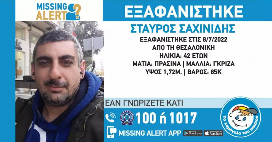 Όπως ανακοίνωσε το Χαμόγελο του Παιδιού, αγνοούμενος είναι ο Σταύρος Σαχινίδης. Έχει ύψος 1,72 και βάρος 85 κιλά. Έχει γκρίζα μαλλιά και πράσινα μάτια.