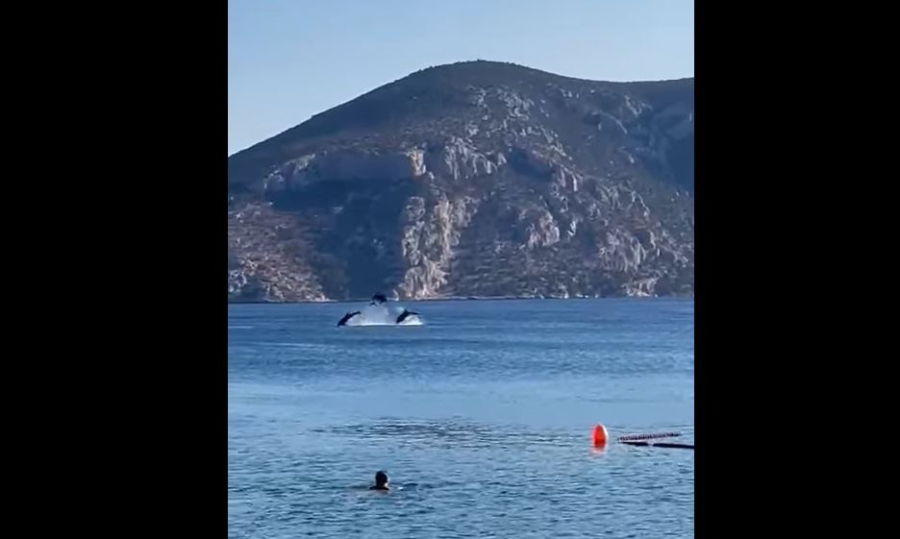 Τα δελφίνια προσέφεραν μια εκπληκτική «χορογραφία» στους παραθεριστές, ενώ δεν έλειψαν και εκείνοι που βούτηξαν στη θάλασσα ώστε να βρεθούν όσο το δυνατόν πιο κοντά τους.