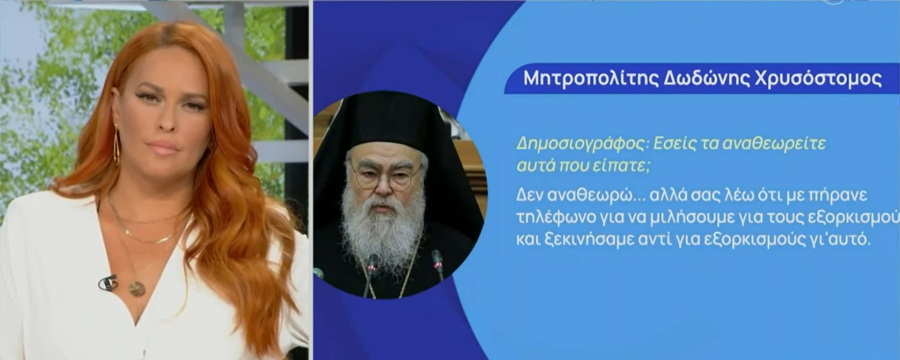 Όταν η δημοσιογράφος ρώτησε τον Μητροπολίτη εάν αναθεωρεί, αυτός απάντησε: «Δεν αναθεωρώ… αλλά σας λέω ότι με πήρανε τηλέφωνο για να μιλήσουμε για τους εξορκισμούς και ξεκινήσαμε αντί για εξορκισμούς γι’ αυτό».