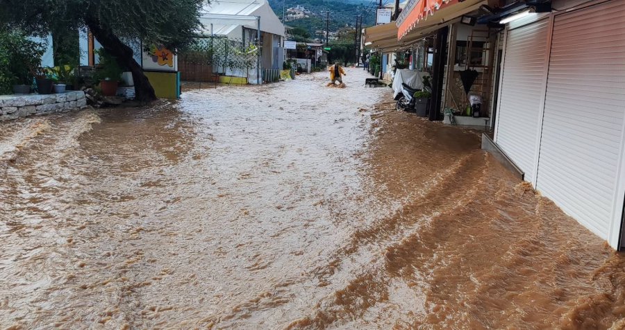 Το νερό που κατεβαίνει από τα βουνά, αναζητώντας διέξοδο στη θάλασσα, έχει «πνίξει» καταστήματα της περιοχής, σε πολλά από τα οποία το νερό έχει ξεπεράσει το μισό μέτρο στο εσωτερικό τους.