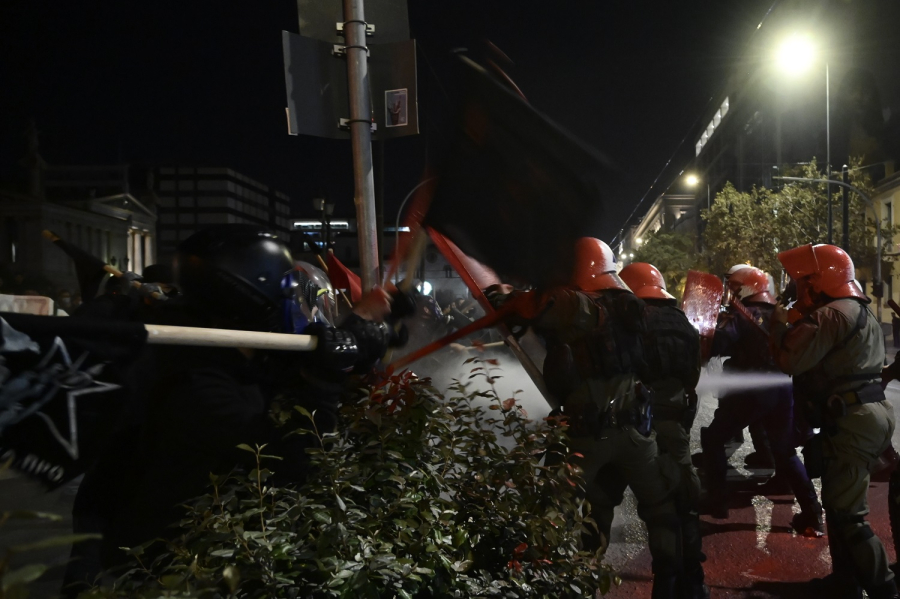 Συμπλοκές σημειώθηκαν στα Προπύλαια με τους διαδηλωτές να πετάνε κόκκινη μπογιά και τα ΜΑΤ να απαντούν με χρήση χημικών.