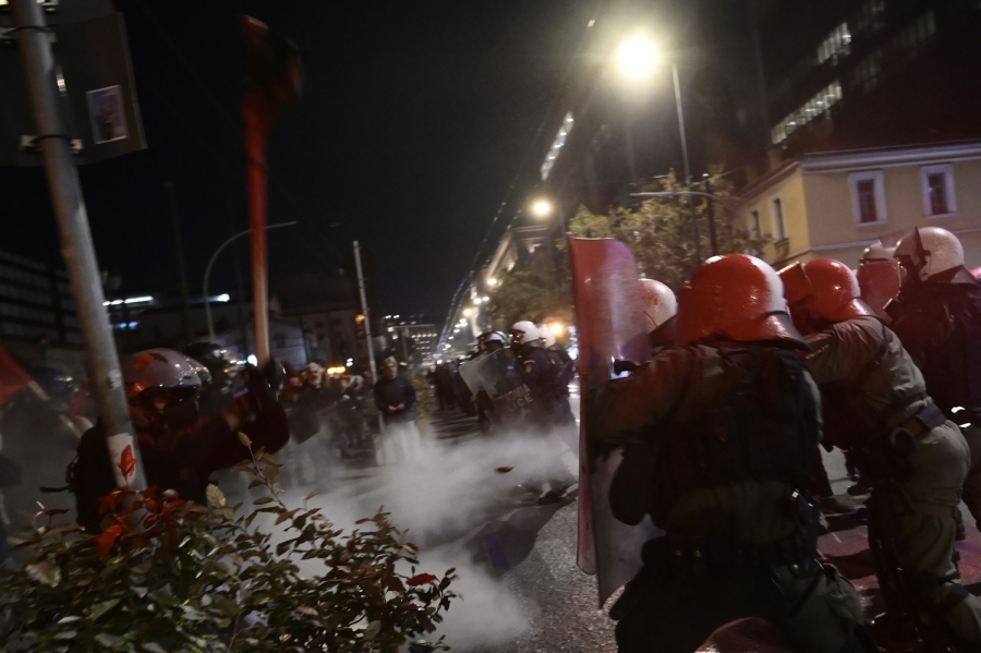 Περίπου στις 20.10, όπως επισημαίνεται στην ανακοίνωση, οι συγκεντρωθέντες έχοντας καλυμμένα τα χαρακτηριστικά των προσώπων τους, επιτέθηκαν στις αστυνομικές δυνάμεις με μπογιές, πέτρες, καδρόνια, μπουκάλια και άλλα αντικείμενα, προκειμένου να τις διασπάσουν και να καταλάβουν όλο το οδόστρωμα, διαταράσσοντας έτσι την κοινωνικοοικονομική ζωή του κέντρου της Αθήνας.