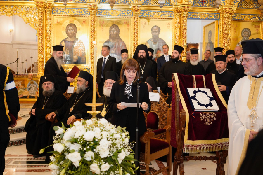 Κατά τον επικήδειο λόγο που εκφώνησε, η κυρία Σακελλαροπούλου αναφέρθηκε στην προσωπικότητα του Μακαριστού Αρχιεπισκόπου Κύπρου, καθώς και το έργο που αφήνει πίσω του. Μίλησε επίσης και για την σημασία της Εκκλησίας της Κύπρου.