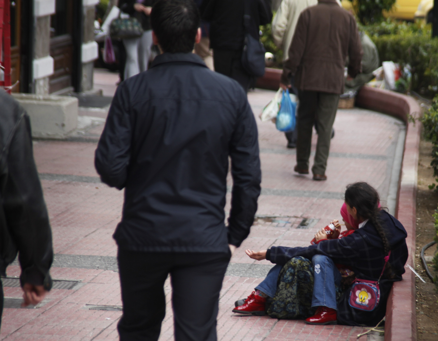 Μία χάρτινη επιγραφή με τη λέξη «ΠΕΙΝΑΩ», μπροστά στα πόδια της, στεριωμένη πάνω σε χαρτόνι και δίπλα σ’ ένα πλαστικό ποτήρι, έδειχναν ότι επαιτούσε.