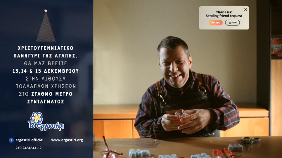 Σας προσκαλούμε για να θαυμάσετε και να διαλέξετε χριστουγεννιάτικα δώρα από τις χειροποίητες δημιουργίες των απασχολούμενών μας και από τη μεγάλη συλλογή προϊόντων, που προσφέρουν εταιρίες και ιδιώτες που στηρίζουν «Το Εργαστήρι».