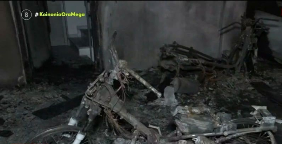 Η φωτιά ξέσπασε πιθανότατα από εμπρησμό -όπως δείχνουν τα πρώτα στοιχεία- και άφησε πίσω της τέσσερα κατεστραμμένα ΙΧ αυτοκίνητα και δύο μηχανάκια, ενώ σημειώθηκαν ζημιές στην πυλωτή και την είσοδο της πολυκατοικίας.