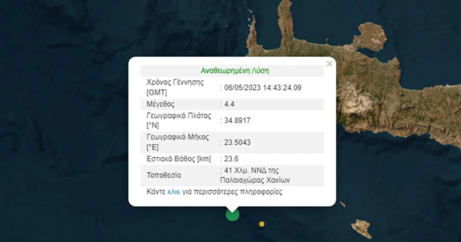 Ο σεισμός έγινε σε εστιακό βάθος 23,6 χιλιομέτρων. Το επίκεντρο του σεισμού στην Κρήτη εντοπίζεται 41 χιλιόμετρα ΝΝΔ της Παλαιοχώρας Χανίων.