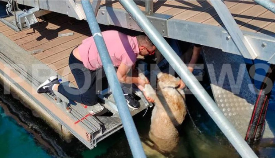 Κάτοικοι και περαστικοί που βρέθηκαν στο λιμάνι της πόλης δεν πίστευαν στα μάτια τους όταν τον είδαν να κλωτσάει το ζώο.