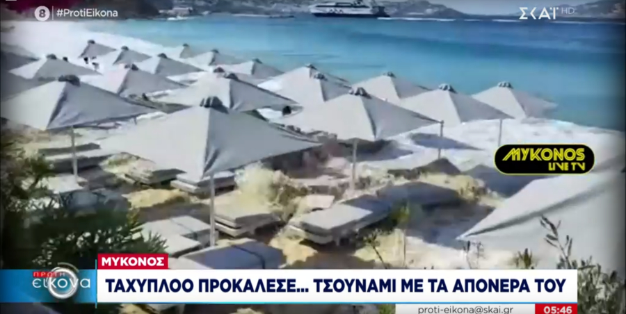 Τα απόνερα από το ταχύπλοο προκάλεσαν κύματα στην παραλία τα οποία παρέσυραν τις ξαπλώστρες και τις ομπρέλες με το νερό να φτάνει μέχρι τον δρόμο.