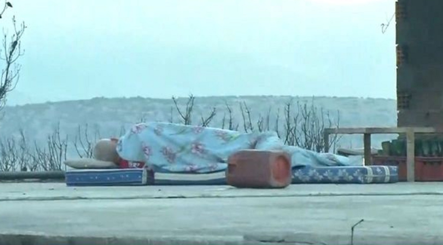 Η εικόνα που συγκλονίζει, ήρθε μέσα από την κάμερα της ΕΡΤ. Ο άντρας φαίνεται να έχει ανέβει στην ταράτσα του καμένου και κατεστραμμένου του σπιτιού, να έχει βάλει δύο μαξιλάρια και να κοιμάται.