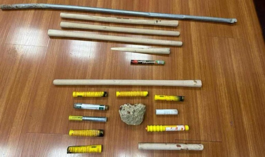 Πρόκειται για λοστούς, μαχαίρια, πέτρες, καπνογόνα, φωτοβολίδες και άλλα αντικείμενα, τα οποία εγκατέλειψαν οι χούλιγκαν στο σημείο της αιματηρής συμπλοκής, μόλις είδαν να καταφθάνουν αστυνομικοί στο σημείο.