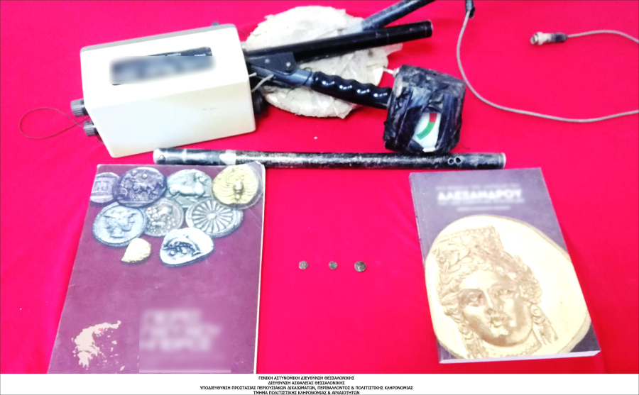 Ειδικότερα, χθες το πρωί πραγματοποιήθηκε οργανωμένη επιχείρηση σε περιοχή των Σερρών, κατά την οποία διενεργήθηκε νομότυπη έρευνα στην οικία του συλληφθέντα, όπου βρέθηκαν και κατασχέθηκαν τρία χάλκινα νομίσματα του 4 ου π.Χ. αιώνα, ένας ανιχνευτής μετάλλων και δύο βιβλία που σχετίζονται με αρχαία νομίσματα.