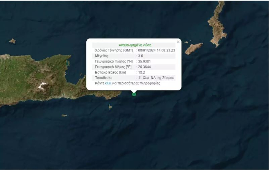 Ο σεισμός προέρχεται από τον εστιακό χώρο που βρίσκεται σε απόσταση 11 χιλιομέτρων νοτιοανατολικά της Ζάκρου.