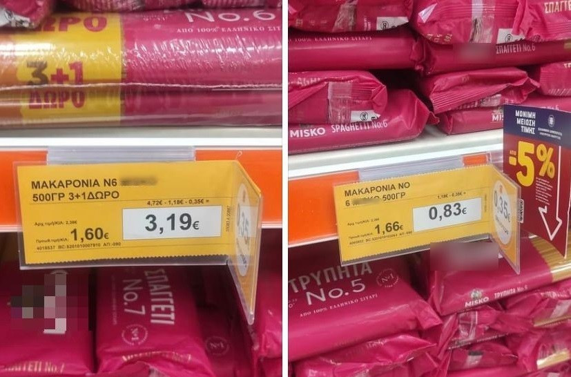Άλλο ένα παράδειγμα είναι οι προσφορές 1+1. Σε φωτογραφία που δημοσίευσε καταναλωτής μακαρόνια 500γρ είναι έχουν προσφορά 3+1 δώρο με τελική τιμή 3,19 ευρώ. Το ένα πακέτο ωστόσο κάνει 0,83 λεπτά, (επί τέσσερα πακέτα 3,32 ευρώ) δηλαδή στην πραγματικότητα το ένα πακέτο δεν είναι δώρο, αφού αν ήταν θα το συνολικό κόστος θα ήταν στα 2,49 ευρώ.