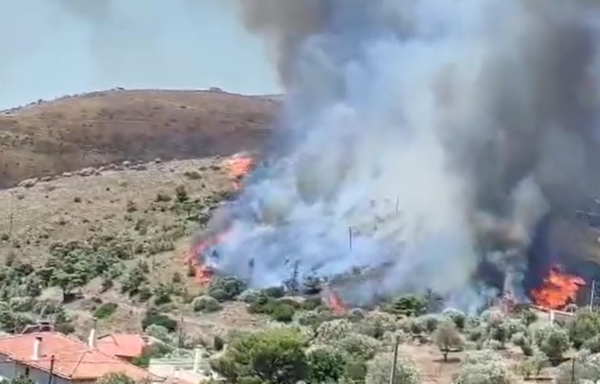 Η φωτιά δείχνει να είναι μεγάλη και καίει κοντά σε σπίτια, ενώ στο σημείο πνέουν ισχυροί άνεμοι 9 μποφόρ.
