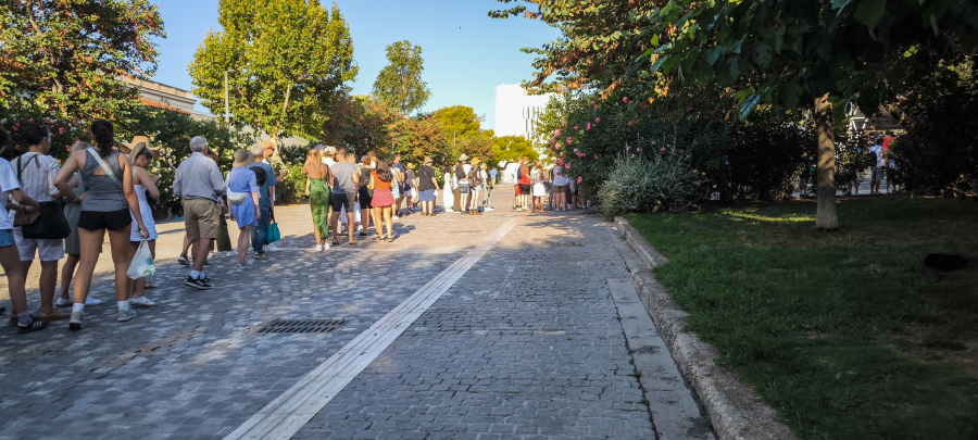 Τεράστιες ουρές σχημάτισαν το πρωί της Δευτέρας τουρίστες που εν μέσω καύσωνα έσπευσαν να επισκεφτούν τον Ιερό Βράχο της Ακρόπολης.
