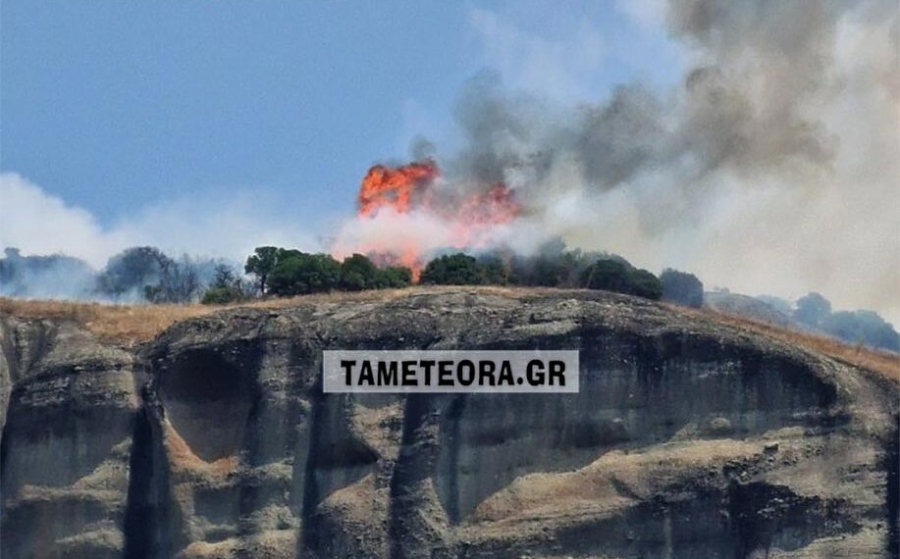 Φωτιά μαίνεται εδώ και λίγη ώρα σε βράχο με θάμνους στα Μετέωρα.