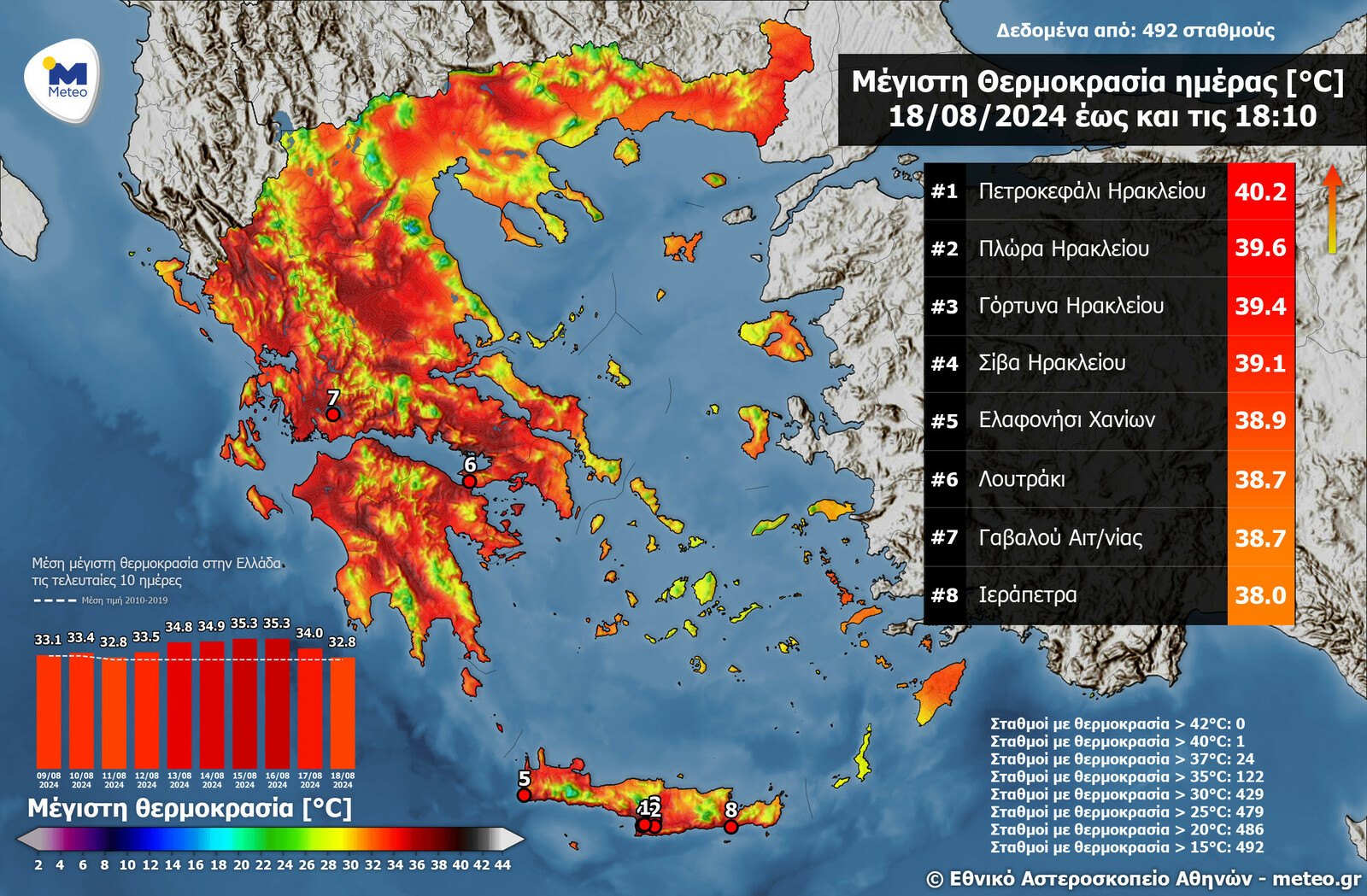 Όπως φαίνεται στον χάρτη που ακολουθεί, η μέγιστη θερμοκρασία της χώρας καταγράφηκε στα Πετροκεφάλι Ηρακλείου με 40.2 °C.