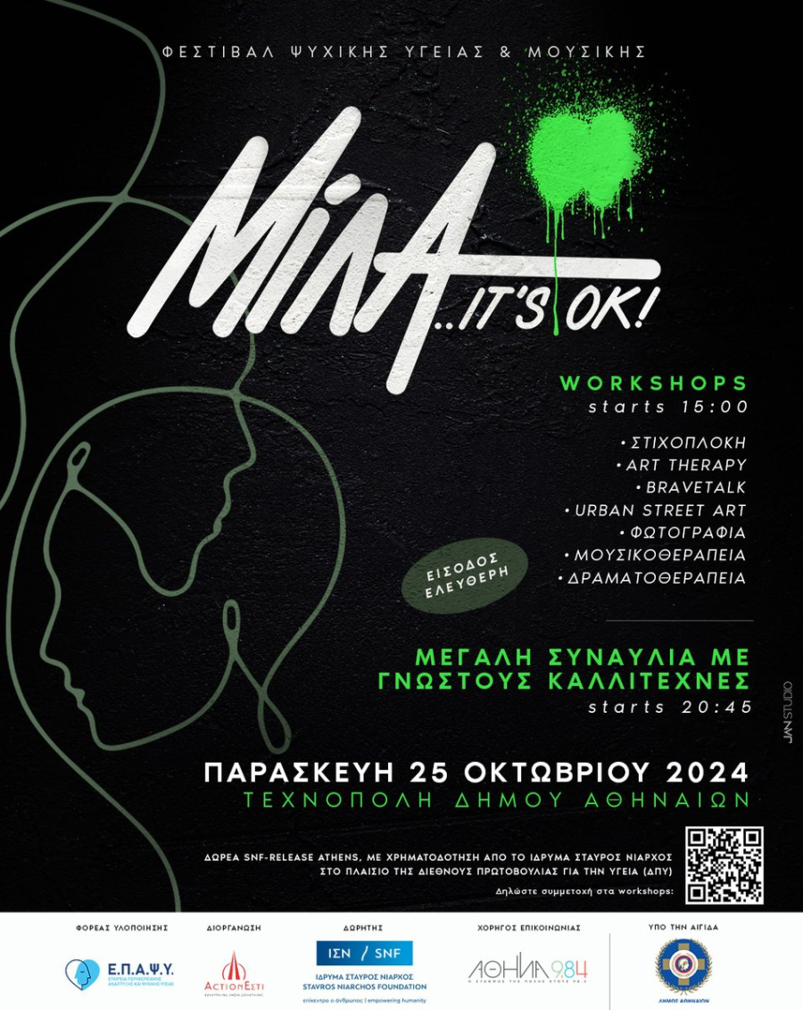 Το 4ο Φεστιβάλ Ψυχικής Υγείας & Μουσικής «ΜΙΛΑ… It’s OK!» έρχεται στην Αθήνα! Καλούμε μικρούς και μεγάλους την Παρασκευή 25 Οκτωβρίου, στην ΤεχνόποληΔήμου Αθηναίων, για να ενημερωθούν, να μιλήσουν και να συμμετάσχουν σε δραστηριότητες για την προαγωγή της ψυχικής υγείας υπό τους ήχους της μουσικής! Γνωστοί και αγαπημένοι καλλιτέχνες θα βρίσκονται εκεί για να στηρίξουν την συγκεκριμένη δράση με μία μεγάλη συναυλία στο τέλος της ημέρας. Αφού πραγματοποίησε με τεράστια επιτυχία τις πρώτες του στάσεις στη Λαμία, τη Λάρισα και τη Σύρο, το «ΜΙΛΑ… It’s OK!» επανέρχεται δυναμικά στην πρωτεύουσα, για να ενισχύσει το αίσθημα του ανήκειν, να προάγει τον διάλογο και να προωθήσει την ψυχική υγεία μέσω της δύναμης της μουσικής και της τέχνης.