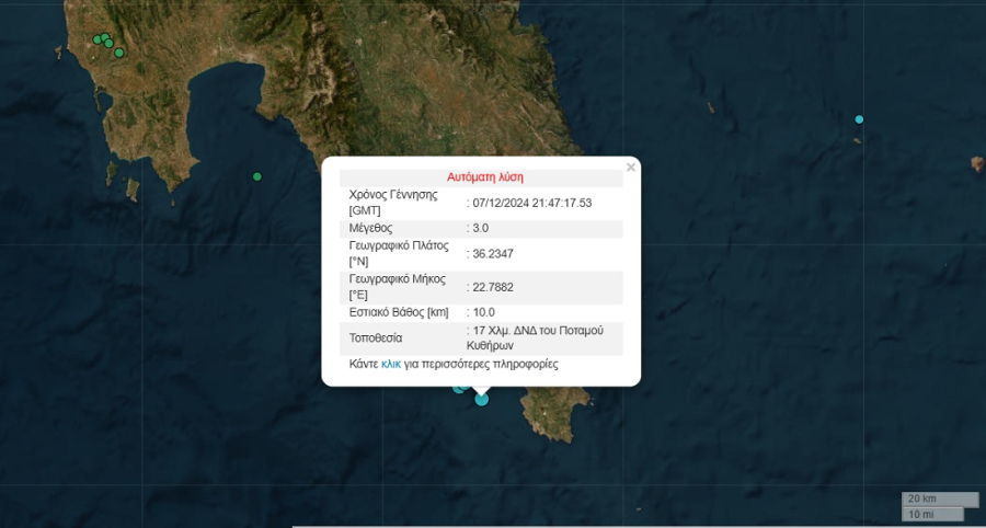 Σεισμός μεγέθους 3 ρίχτερ σημειώθηκε το βράδυ του Σαββάτου στα Κύθηρα. Η δόνηση σύμφωνα με το Εθνικό Αστεροσκοπείο Αθηνών σημειώθηκε στις 23:47 με επίκεντρο 17 Χλμ. ΔΝΔ του Ποταμού Κυθήρων.