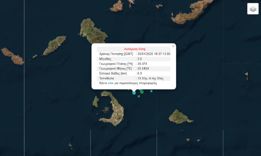 Δεν έχει σταματήσει να δονείται η Σαντορίνη από τους τεκτονικούς σεισμούς. Το βράδυ της Πέμπτης και συγκεκριμένα στις 20:37 σημειώθηκε σεισμός 3 ρίχτερ με επίκεντρο 15 Χλμ. ανατολικά της Οίας. Το εστιακό βάθος του σεισμού ήταν 6,9 χλμ, ενώ νωρίτερα στις 19:54 είχαμε σεισμό 2,4 ρίχτερ, 2,6 ρίχτερ στις 19:16 και 3,1 ρίχτερ στις 12:30 το μεσημέρι.
