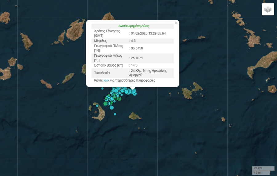 Η δόνηση σημειώθηκε 35,2χλμ. ανατολικά- βορειοανατολικά της Θήρας, με το εστιακό βάθος να εντοπίζεται στα 2 χλμ.