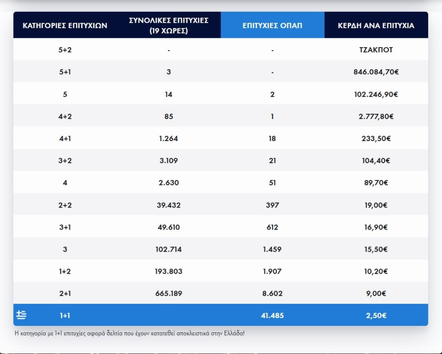 Νέο τζακ ποτ είχαμε στην σημερινή κλήρωση του Eurojackpot, ωστόσο 3 τυχερά δελτία κερδίζουν από 846.084,70€, ενώ 14 δελτία, εκ των οποίων 2 παίχτηκαν στην Ελλάδα, κερδίζουν από 102.246,90€.