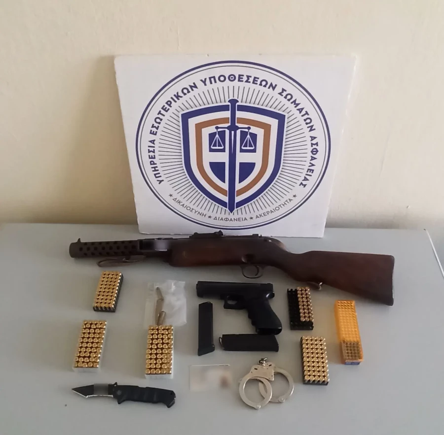 Από την έρευνα που πραγματοποιήθηκε, στην κατοχή του βρέθηκαν πιστόλι, δύο γεμιστήρες με -23- φυσίγγια, χειροπέδες, μαχαίρι και υπηρεσιακό δελτίο ταυτότητας, ενώ διαπιστώθηκε ότι το όχημα αναζητούνταν από την Υπηρεσία Εσωτερικών Υποθέσεων Σωμάτων Ασφαλείας στο πλαίσιο ποινικής διαδικασίας.