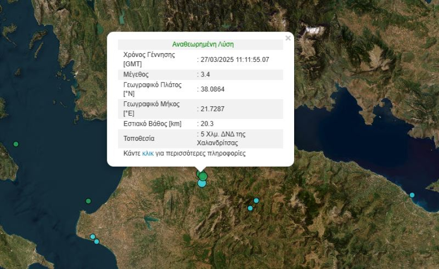 Ειδικότερα, σύμφωνα το Γεωδυναμικό Ινστιτούτο του Εθνικού Αστεροσκοπείου Αθηνών, ο σεισμός είχε μέγεθος 3,4 βαθμών της κλίμακας Ρίχτερ και το επίκεντρο εντοπίστηκε 5 χιλιόμετρα, δυτικά, νοτιοδυτικά της περιοχής, Χαλανδρίτσα, του Δήμου Ερυμάνθου.