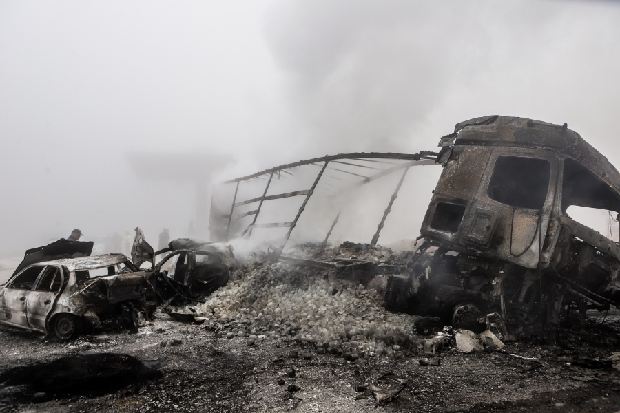 Νέες φωτογραφίες από το σημείο αποτυπώνουν τη σφοδρότητα και τη φρίκη του δυστυχήματος, το οποίο συνέβη μέσα σε πυκνή ομίχλη. Στις φωτογραφίες φαίνεται το «κουφάρι» της νταλίκας που έπεσε σε δύο ΙΧ και στο κουβούκλιο των διοδίων, ενώ δίπλα είναι δύο απανθρακωμένα ΙΧ, που επίσης τυλίχθηκαν στις φλόγες μετά τη σύγκρουση.