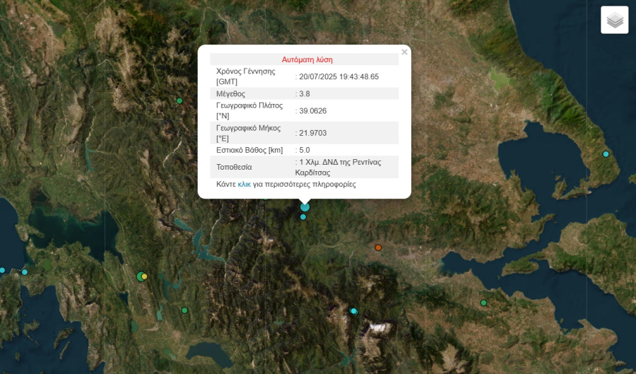 Σεισμός μεγέθους 3,8 ρίχτερ σημειώθηκε στην Ρεντίνα Καρδίτσας. Η δόνηση είχε επίκεντρο 1 χλμ. ΔΝΔ της Ρεντίνας Καρδίτσας και έγινε στις 22:43.