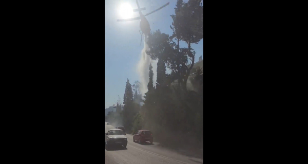 Όπως φαίνεται στα πλάνα, ο αέρας από το ελικόπτερο που επιχειρεί σπάει ενά τεράστιο κλαδί που προσγειώνεται στα οχήματα οδηγών που εξακολουθούν να κινούνται στις ζώνες της φωτιάς.