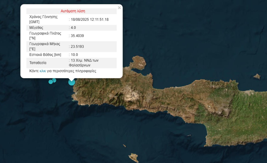 Λίγο νωρίτερα, στις 15:02, το Γεωδυναμικό Ινστιτούτο Αθηνών είχε καταγράψει σεισμική δόνηση μεγέθους 3,6 Ρίχτερ στον νομό Χανίων. Το επίκεντρο εντοπίστηκε 7 χιλιόμετρα νοτιοδυτικά των Φαλασάρνων, με το ίδιο εστιακό βάθος, στα 5 χιλιόμετρα.